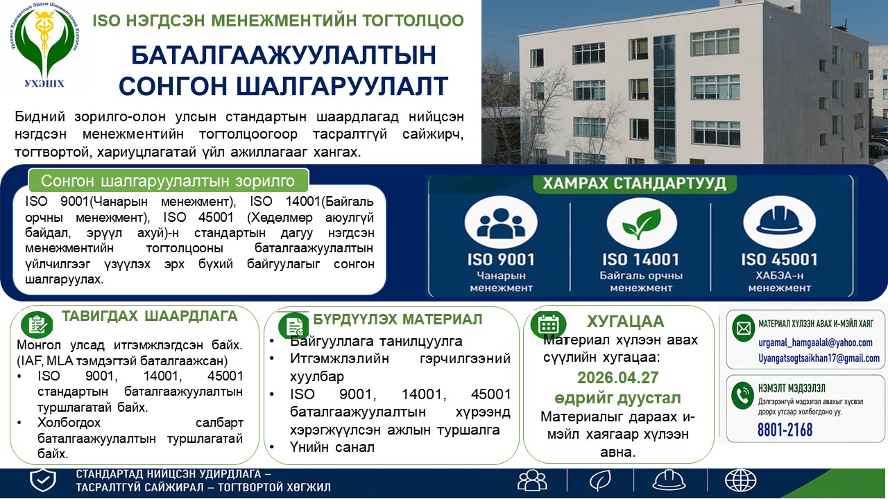 Нэгдсэн менежментийн тогтолцоо баталгаажуулалтын сонгон шалгаруулалт Posted on 2026/04/23 Posted in Мэдээ Leave a comment